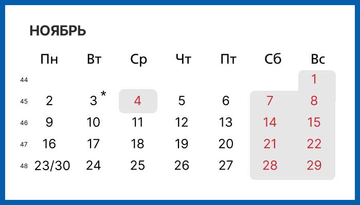 Праздничные и выходные дни в ноябре 2026 года в России